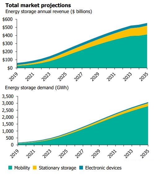 Lux Research發布了一份名為“Global Energy Storage Market Forecast 2019”的報告,預測未來15年,全球儲能市場裝機容量將以更快的速度增長,到2035年,累計裝機規模將達到3046GWh,年復合增長率為20%,年收入將達到5460億美元,年復合增長率為14.9%。