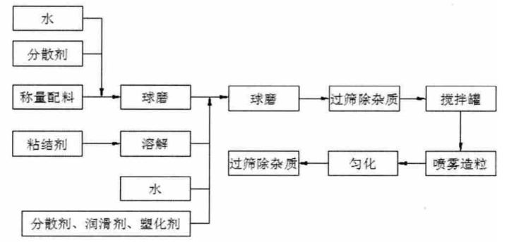 噴霧造粒法是把坯料和塑化劑混合后配置成固相含量一定的漿料,然后用噴霧器將漿料噴入造粒塔進行霧化,就能夠得到流動性較好的球狀顆粒。這種方法的產量大,適合工業化生產。