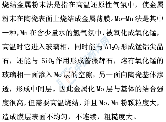 陶瓷金屬化的方法主要有化學鍍Ni-P法、電鍍Ni-P合金法、高溫燒結被Ag(Ni)法、Mo-Mn燒結法、真空蒸發鍍膜法和真空濺射鍍膜法等。