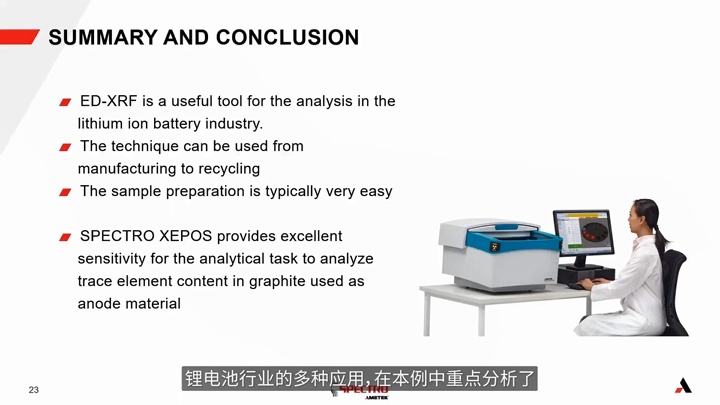 Dirk Wissmann經(jīng)理在報(bào)告中對鋰離子電池的構(gòu)成及工作原理做了簡要介紹,講解了鋰電池的四大主材,正極、負(fù)極、隔膜及電解液。他系統(tǒng)的介紹了XRF的基礎(chǔ)知識(shí),結(jié)合ED-XRF儀器,對XRF技術(shù)進(jìn)行講解,并向大家闡述了SPECTRO XEPOS儀器的特色以及在鋰電石墨負(fù)極、硅負(fù)極痕量元素分析方面的應(yīng)用。