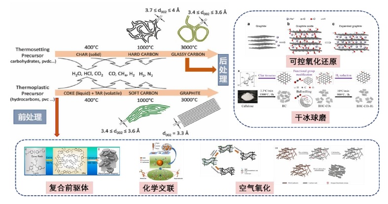 對(duì)于碳材料結(jié)構(gòu)調(diào)控方法根據(jù)作用階段可以分為前處理、后處理過(guò)程(如圖3所示),根據(jù)處理種類(lèi)可以分為熱處理、物理/化學(xué)活化法以及機(jī)械化學(xué)方法等常用方法。后處理過(guò)程主要對(duì)目標(biāo)碳材料進(jìn)行改性處理直接用于鈉離子電池負(fù)極,在調(diào)控微晶結(jié)構(gòu)的同時(shí)可能引入諸多不可逆位點(diǎn)。前處理過(guò)程相對(duì)于后處理來(lái)說(shuō),主要針對(duì)前驅(qū)體進(jìn)行改性處理,不需要嚴(yán)苛的處理?xiàng)l件,是重要的溫和改性方式。前處理主要是影響材料在炭化時(shí)的結(jié)構(gòu)演變過(guò)程,以微晶結(jié)構(gòu)的變化為主要作用,同時(shí)減少部分不可逆位點(diǎn)的分布。