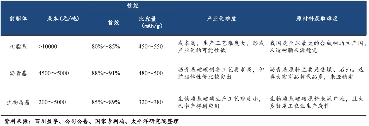 其中生物質前驅體生產工藝難度小,但難點在于合適前驅體的篩選和穩定批量供應。在鈉電產業鏈還不成熟的行業初期階段,生物質硬碳由于其性能優異,產業化推進的速度相對較快。