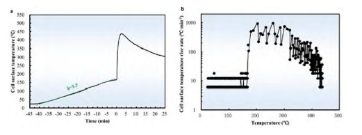 圖1 (a)電池溫度隨時間變化圖;(b)電池升溫速率與溫度的變化圖