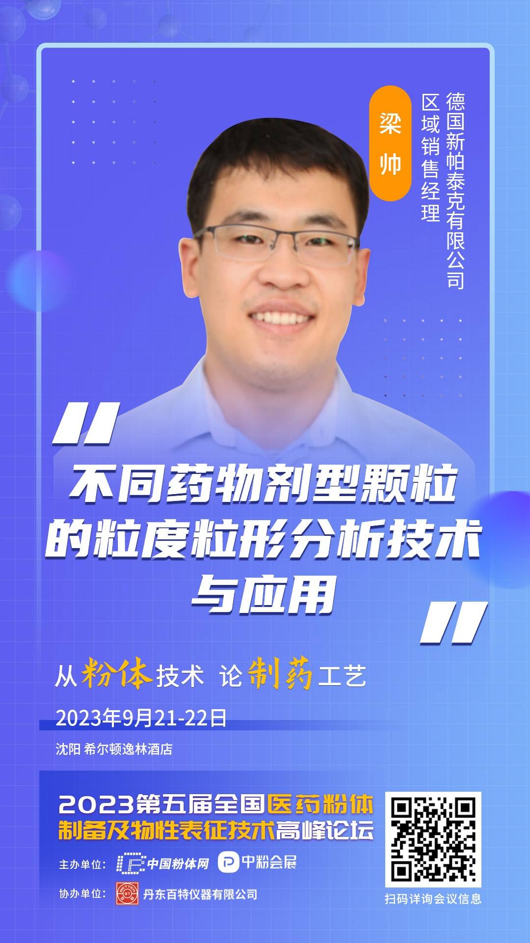 2023年9月21-22日,中國粉體網以“從粉體技術,論制藥工藝”為主題,將在遼寧沈陽希爾頓逸林酒店舉辦“第五屆全國醫藥粉體制備及物性表征技術高峰論壇”,屆時將邀請來自德國新帕泰克有限公司的銷售經理梁帥先生作《不同藥物劑型顆粒的粒度粒形分析技術與應用》報告,現場報告中,報告主講人將列舉實際應用案例,分享不同藥物的粒度粒形解決方案。