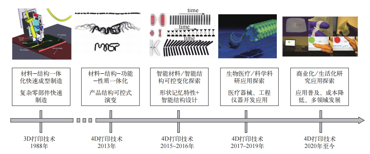 4D打印發展歷程及技術特點(來源:馮韜等,《4D打印智能材料及產品應用研究進展》)