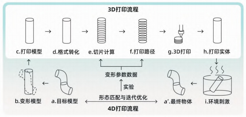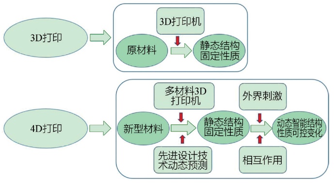 與3D打印相同,4D打印是一種集材料科學、機械科學以及計算機科學等諸多學科高度交叉融合的先進制造技術。但又與3D打印不同,4D打印是一種具備動態演變能力的智能制造技術,是在3D打印基礎上結合智能材料與智能結構設計,針對制造產品的形態、性能和功能方面的進一步發展。