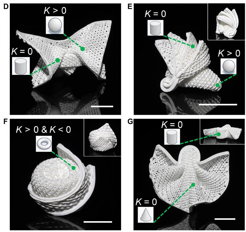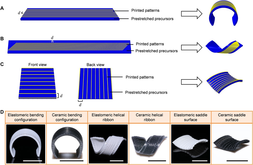 第二種方法是通過將陶瓷前驅體按照設計好的紋路打印在預拉伸的陶瓷前驅體上,在預應力被釋放時,就會發生4D變形。通過設計在預拉伸表面打印的路徑可以控制應力釋放后的4D變形。文中以幾個有代表性的拓撲結構作為例子,展示了彎曲,螺旋和馬鞍面的打印過程。