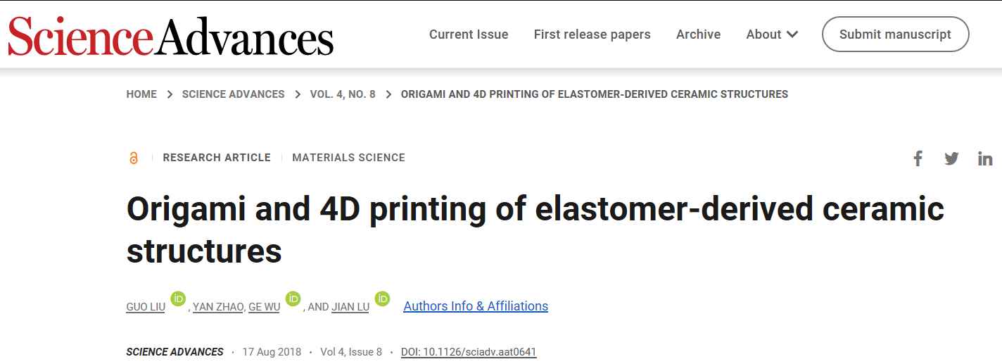 6、Liu, Guo, et al.,《Origami and 4D printing of elastomer-derived ceramic structures》