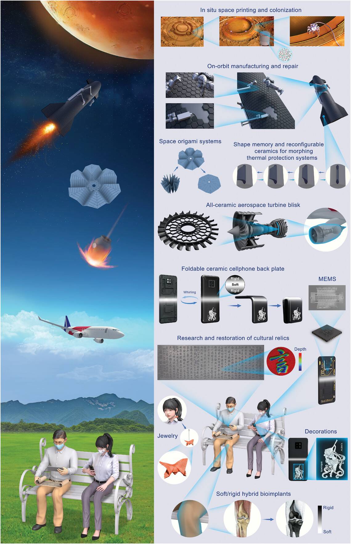該工作首次實現了4D增減材復合制造陶瓷,亦首次實現了4D打印形狀記憶陶瓷。該工作提出的4D增減材復合制造形狀記憶陶瓷技術可實現高精度(十微米級),大尺寸(十厘米級),超快的前驅體轉變為陶瓷的速度(幾秒鐘內),以及前驅體材料的快速制造(批量生產能力),有力推動了陶瓷4D打印技術的潛在應用發展,有望應用于航空航天(全陶瓷整體渦輪葉盤、可變形熱防護系統,太空折疊系統,在軌制造和修復,原位太空打印和殖民等)、3C電子(可折疊陶瓷手機背板、微機電系統等)、生物醫療(生物植入物等)、和藝術(文物研究和修復、首飾、裝飾品等)等領域。