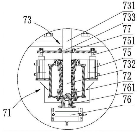 摘要:本實用新型提供的大型流化床式氣流粉碎機,包括機座、筒體、配氣盤、電機、出料器、頂蓋、快拆機構,頂蓋罩設在筒體上部的分級筒頂部,其邊緣通過鎖緊螺栓與分級筒連接,快拆機構連接頂蓋中部和分級筒外壁,其包括連接在分級筒外壁上的基座、設于基座內的直線軸承、可升降且可轉動地穿設在直線軸承內的頂桿、用于連接頂桿和頂蓋的連接板,以及連接在基座上的升降氣缸和旋轉氣缸,通過使頂桿中部與升降氣缸的氣缸桿相連接,使頂桿下端部可上下移動地套設在旋轉氣缸的旋轉軸上,在拆下鎖緊螺栓后,能夠通過升降氣缸動作,使頂桿向上頂起頂蓋,再通過旋轉氣缸動作,即可帶動頂桿轉動,使頂蓋從分級筒的頂部移開,頂蓋拆卸方便、拆卸過程安全性好。