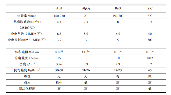電絕緣材料主要有陶瓷材料、塑料材料等。先進陶瓷材料有著絕緣性好、熱導率高、高強度、熱膨脹系數低等特點,完全可以成為LED照明用基板的新材料。現階段,國際上對于大功率LED新型封裝基板的研究也主要集中在高導熱的陶瓷基板領域,常用的幾種陶瓷基板有:氧化鋁陶瓷基板、氮化鋁陶瓷基板、氧化鈹陶瓷基板、碳化硅陶瓷基板。