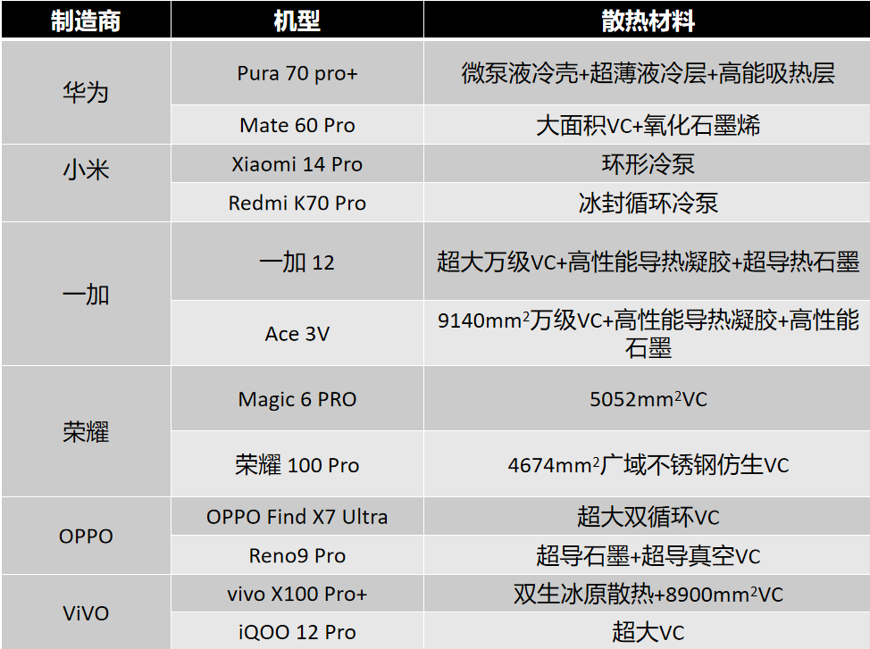 隨著手機散熱需求的水漲船高,傳統(tǒng)的散熱方案已然無法滿足終端散熱需求,在手機輕小薄的發(fā)展背景下,手機廠商的散熱技術(shù)也在不斷更新迭代。下表為中國部分廠商5G手機的散熱方案。總體來看,石墨及石墨稀相較于銅、鋁,在手機熱管理領(lǐng)域中仍然占據(jù)重要地位,均熱板憑借其優(yōu)良的導(dǎo)熱性能和形態(tài)優(yōu)勢逐漸滲透并占據(jù)了高端手機散熱的大部分市場。