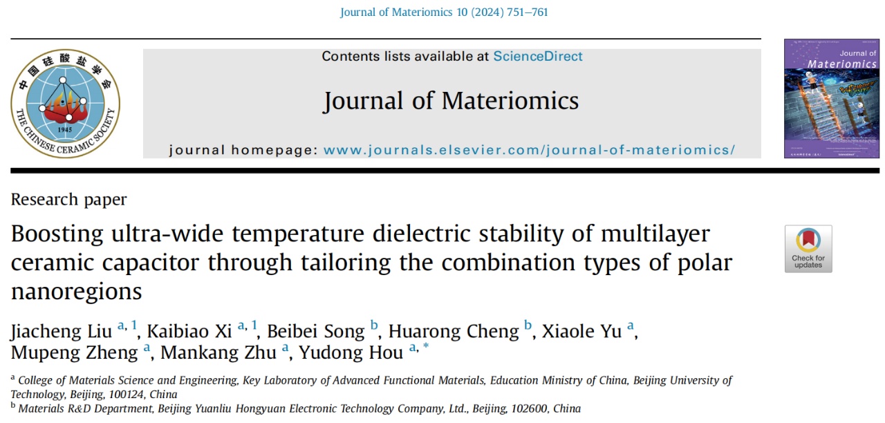 該工作表明調(diào)制弛豫鐵電體PNRs組合類型是設(shè)計超寬溫MLCC的有效策略。相關(guān)成果以“Boosting ultra-wide temperature dielectric stability of multilayer ceramic capacitor through tailoring the combination types of polar nanoregions”為題發(fā)表于中科院一區(qū)期刊《Journal of Materiomics》,通訊作者為侯育冬教授,碩士研究生劉嘉成和博士研究生席凱彪為論文的共同一作,北京工業(yè)大學(xué)為第一通訊單位,合作單位為北京元六鴻遠(yuǎn)電子科技股份有限公司。