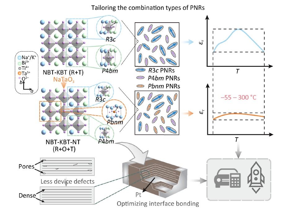 圖1. 超寬溫MLCCs設(shè)計策略示意圖: PNRs組合類型調(diào)制與器件異質(zhì)界面結(jié)構(gòu)優(yōu)化