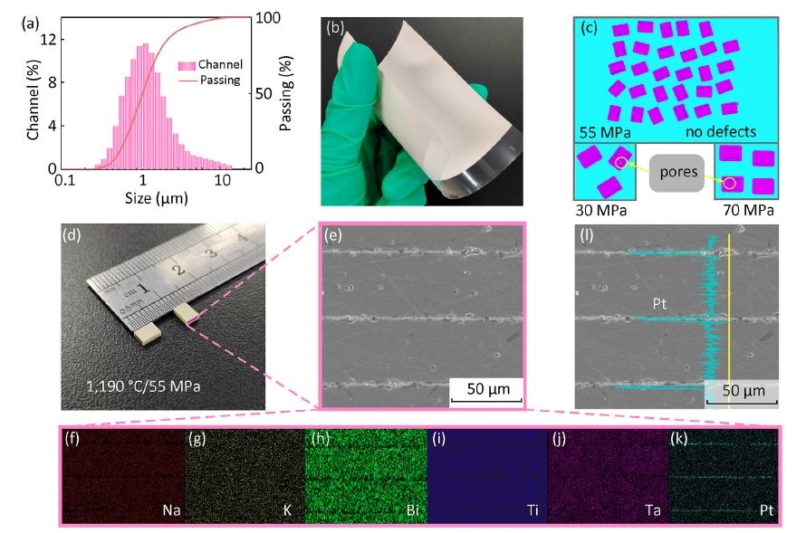 圖2. (a) NBT-KBT-0.31NT粉體的粒徑分布;(b) NBT-KBT-0.31NT流延膜的光學(xué)照片;(c) 不同層壓壓力NBT-KBT-0.31NT MLCC的超聲無損探測掃描圖像;(d) MLCC尺寸測量光學(xué)照片;(e) MLCC橫截面掃描照片;(f-k)Na、K、Bi、Ti、Ta和Pt元素分布;(l) MLCC橫截面Pt元素線掃分析
