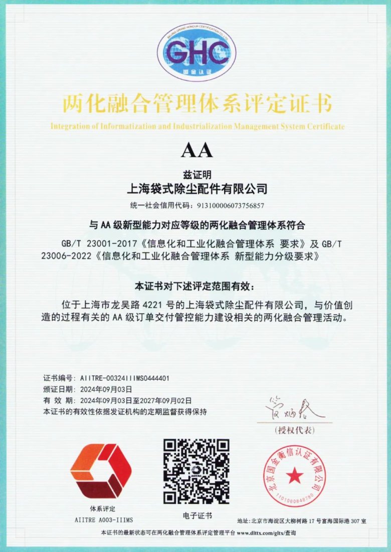 上海袋式除塵配件有限公司順利通過國家工業(yè)和信息化部《信息化和工業(yè)化融合管理體系 要求》(GB/T 23001-2017)及《信息化和工業(yè)化融合管理體系 新型能力分級(jí)要求》(GB/T23006-2022)體系認(rèn)證,獲得AA級(jí)評(píng)定證書。