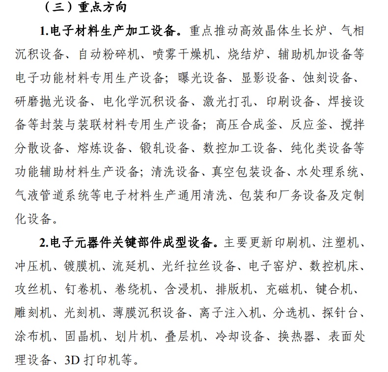 重點(diǎn)方向包括電子材料生產(chǎn)加工設(shè)備、電子元器件關(guān)鍵部件成型設(shè)備、電子元器件加工組裝設(shè)備、電子元器件與材料先進(jìn)檢測(cè)設(shè)備、工業(yè)操作系統(tǒng)、工業(yè)軟件。