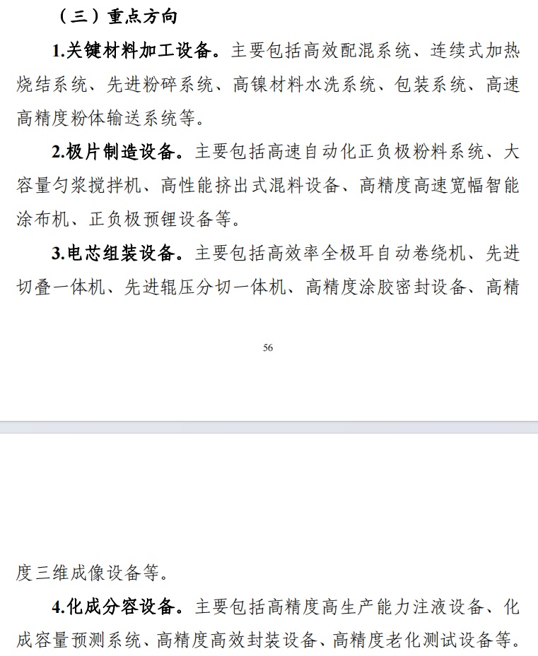 重點(diǎn)方向包括:關(guān)鍵材料加工設(shè)備、極片制造設(shè)備、電芯組裝設(shè)備、化成分容設(shè)備、系統(tǒng)集成設(shè)備等。