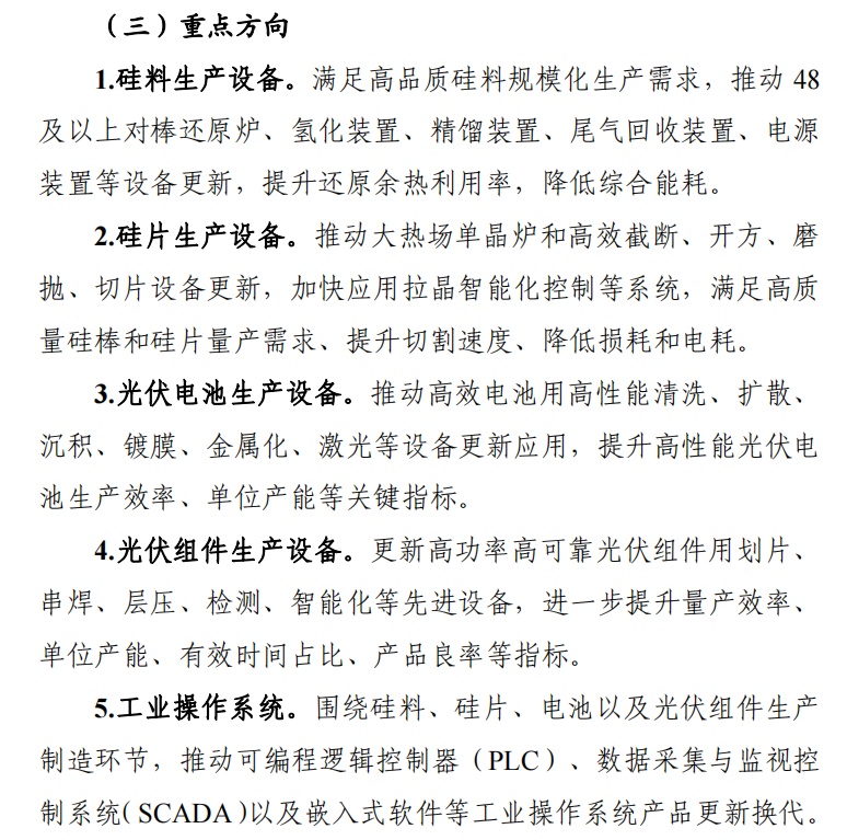 對(duì)于光伏行業(yè),以產(chǎn)線升級(jí)和提升高端化、智能化、綠色化發(fā)展水平為重點(diǎn),重點(diǎn)更新改造多晶硅、硅片、電池、組件等主要環(huán)節(jié)關(guān)鍵設(shè)備,提升設(shè)備生產(chǎn)效率、良率、單體規(guī)模和產(chǎn)品性能、穩(wěn)定性、一致性、可靠性,促進(jìn)構(gòu)建適應(yīng)能源轉(zhuǎn)型需求的現(xiàn)代化光伏產(chǎn)業(yè)體系和新能源基礎(chǔ)設(shè)施網(wǎng)絡(luò)。到2027年,光伏產(chǎn)業(yè)關(guān)鍵環(huán)節(jié)智能制造、綠色制造水平大幅提升,量產(chǎn)效率、產(chǎn)品良率等性能持續(xù)提升,電耗、水耗等能耗指標(biāo)明顯降低,市場(chǎng)主流電池、組件等產(chǎn)品效率提高5%以上。