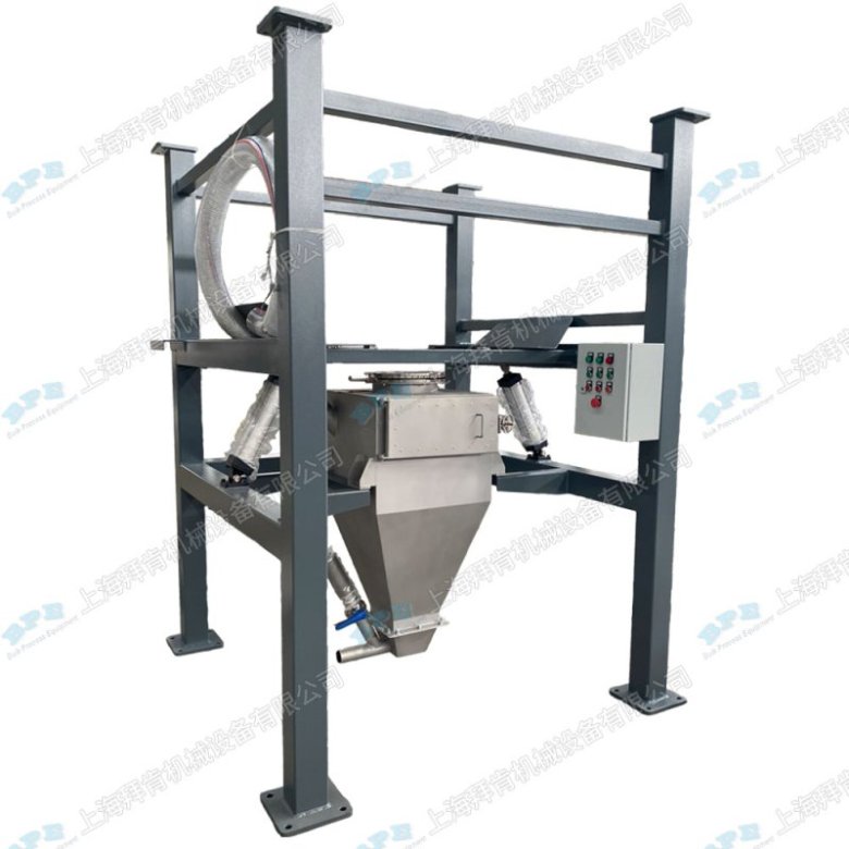小袋倒袋站用于袋裝粉粒狀物料拆袋卸料作業。在塑料、食品行業和其他行業使用,對小袋裝如各種添加劑、石灰粉和PVC粉等干燥的粉粒狀物料進行拆袋卸料作業。它通過人工拆袋,自動傾倒等步驟使物料靠重力落進貯斗中來完成拆袋卸料工作,作業中產生的粉塵被所攜帶的除塵裝置濾除,使工人能在清潔的環境中輕松地工作。