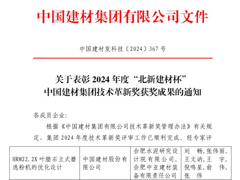 近日,中國建材集團公布了2024 年度“北新建材杯” 中國建材集團技術革新獎評選結果,公司申報的“HRM22.2X葉臘石立式磨選粉機的優化設計”項目榮獲技術改造類二等獎。