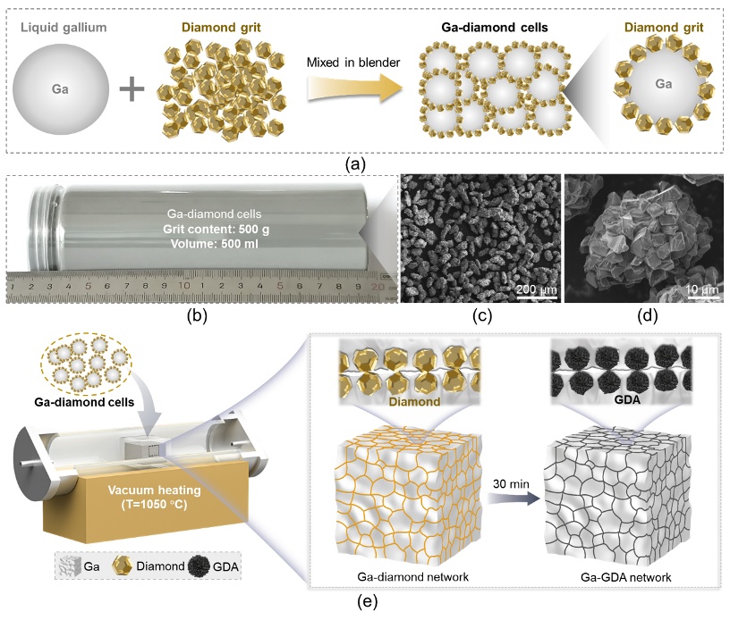 針對這一難題,上海交通大學沈彬教授課題組將液態金屬鎵微液滴化與快速原位裹覆金剛石顆粒,構筑了一種鎵-金剛石“細胞式”的懸浮浸潤網絡,從而實現了金剛石顆粒多表面的原位石墨烯生長與批量制備。這種“細胞式”的懸浮浸潤策略可實現千克級的石墨烯-金剛石共價異質顆粒的制備,相比傳統的制備方法的有效產率提升3-5個數量級,具有廣闊的工業應用前景。相比傳統金剛石磨粒,這一新型磨粒在超硬半導體材料(金剛石、碳化硅等)的拋光加工中具有更高的拋光效率與更高的拋光質量,其原子級材料去除率是傳統金剛石磨粒的5倍。