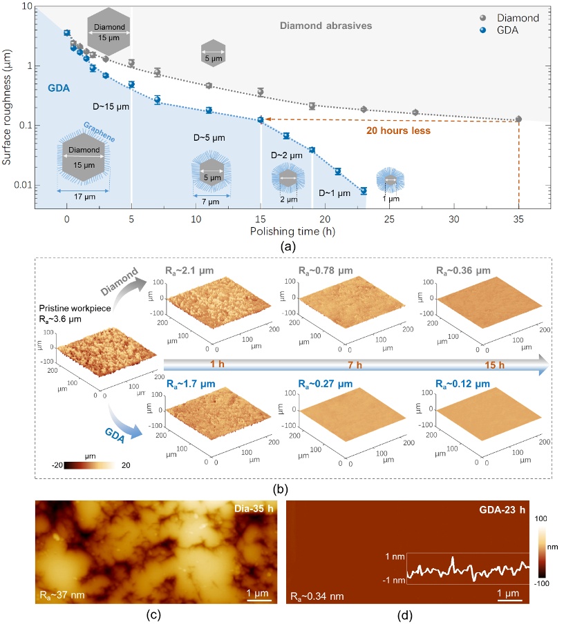 石墨烯共價裝甲金剛石磨粒(GDA)與傳統金剛石磨粒的拋光性能對比(拋光工件為金剛石):GDA拋光效率顯著提升,拋光表面無裂紋