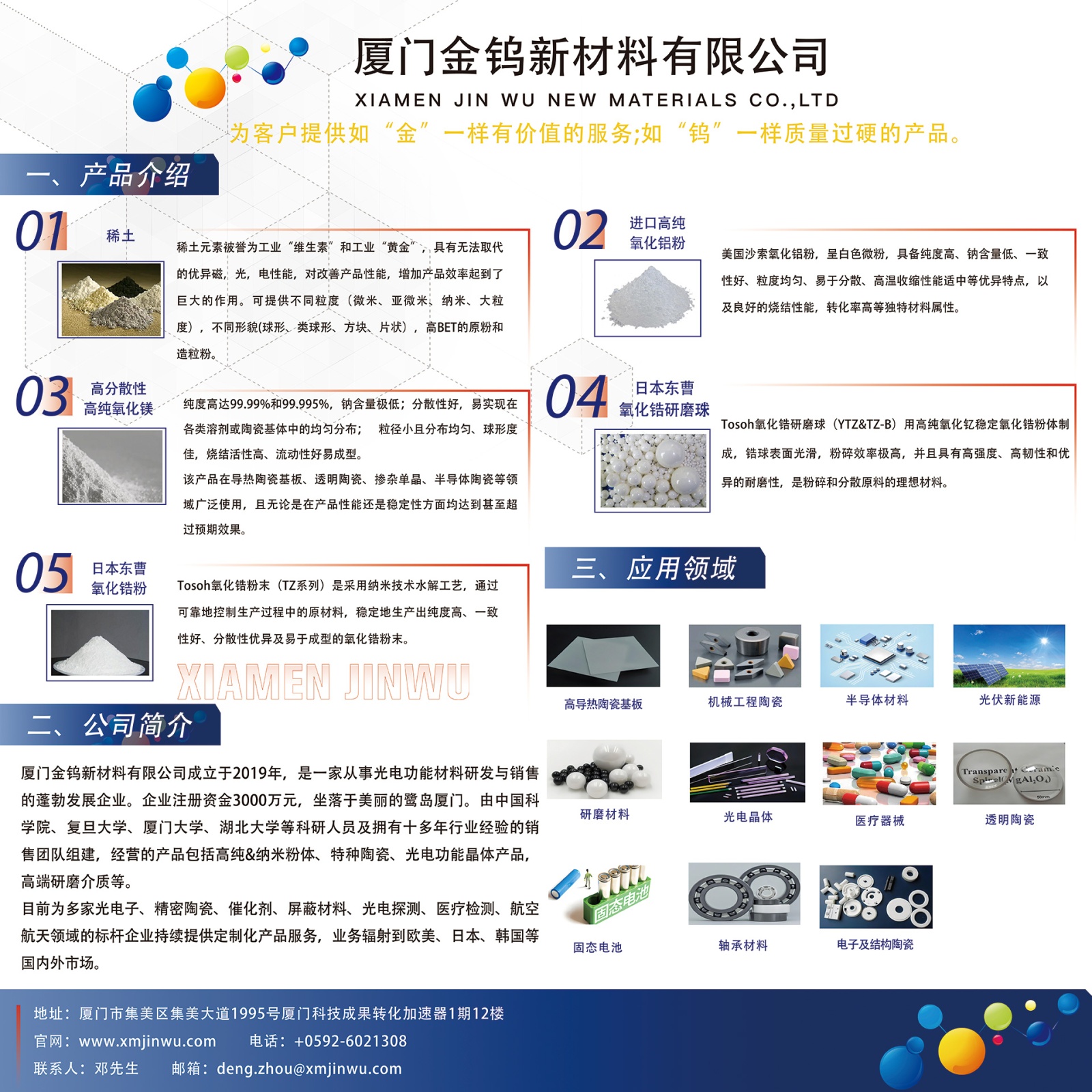 廈門金鎢新材料有限公司成立于2019年,是一家從事光電功能材料研發(fā)與銷售的蓬勃發(fā)展企業(yè)。企業(yè)注冊(cè)資金3000萬元,坐落于美麗的鷺島廈門。由中國科學(xué)院、復(fù)旦大學(xué)、廈門大學(xué)、湖北大學(xué)等科研人員及擁有十多年行業(yè)經(jīng)驗(yàn)的銷售團(tuán)隊(duì)組建,經(jīng)營的產(chǎn)品包括高純&納米粉體、特種陶瓷、光電功能晶體產(chǎn)品等。
