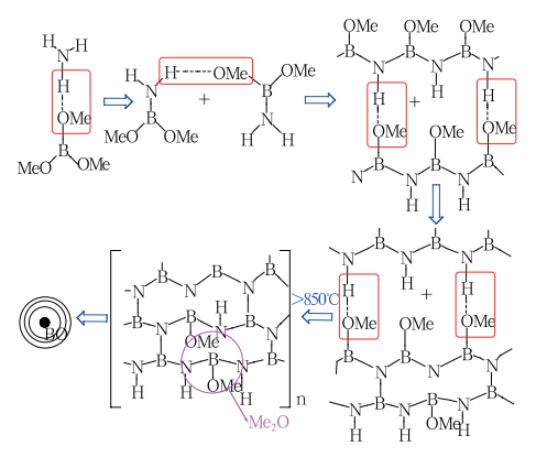 殘余雜質(zhì)氧理論認為球形形貌的形成主要依賴于Me2O基團消除時殘余雜質(zhì)氧的產(chǎn)生。BN的形成機理為:B(OMe)3+NH3→BN+3MeOH。具體的化學形成機制如下圖。