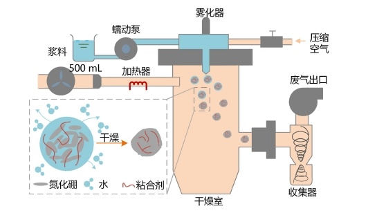 噴霧干燥法制備球形氮化硼的過程可分為3個基本步驟:漿料的制備(氮化硼穩(wěn)定分散液),噴霧干燥,真空燒結(jié)。該方法適用于制備高導熱特性的球形BN。