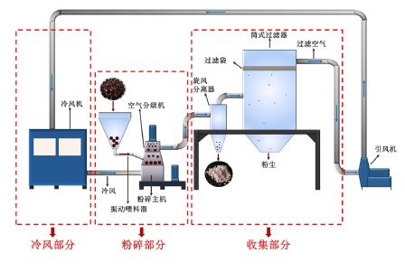 在整個(gè)粉碎過(guò)程中,冷風(fēng)機(jī)產(chǎn)生冷風(fēng)并通過(guò)引風(fēng)機(jī)輸送至粉碎腔內(nèi),使整個(gè)粉碎過(guò)程的溫度保持在20℃以下,可以減少熱敏物質(zhì)的損失。此外,可以通過(guò)調(diào)節(jié)關(guān)鍵參數(shù)(分級(jí)機(jī)頻率、粉碎主機(jī)頻率、引風(fēng)機(jī)頻率)來(lái)改變低溫沖擊磨的粉碎效果。
