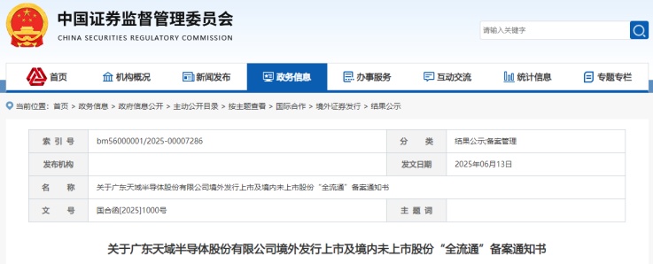 中國粉體網訊 6月13日,中國證監會發布公告,廣東天域半導體股份有限公司(以下簡稱“天域半導體”)正式通過境外發行上市及“全流通”備案,計劃發行不超過4640.8萬股H股,17名股東持有的2891.9萬股境內股份將轉為港股流通。
