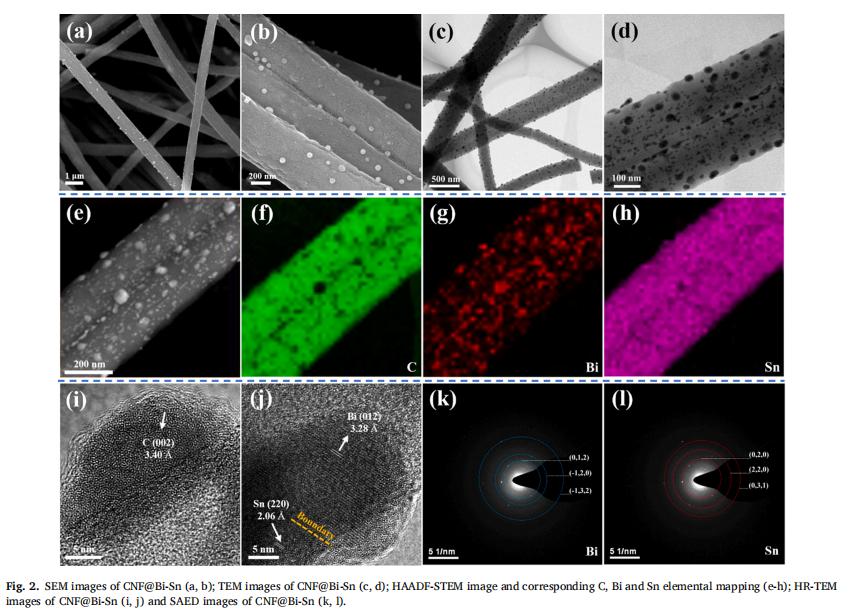 中國粉體網(wǎng)訊 近日,蘇州科技大學劉波教授課題組通過靜電紡絲法結(jié)合原位熱還原工藝,制備了一種無粘結(jié)劑且柔性的自支撐電極,該電極由雙金屬Bi-Sn納米顆粒錨定在碳納米纖維(CNF@Bi-Sn)中構(gòu)成,并首次應(yīng)用于鎂離子電池。