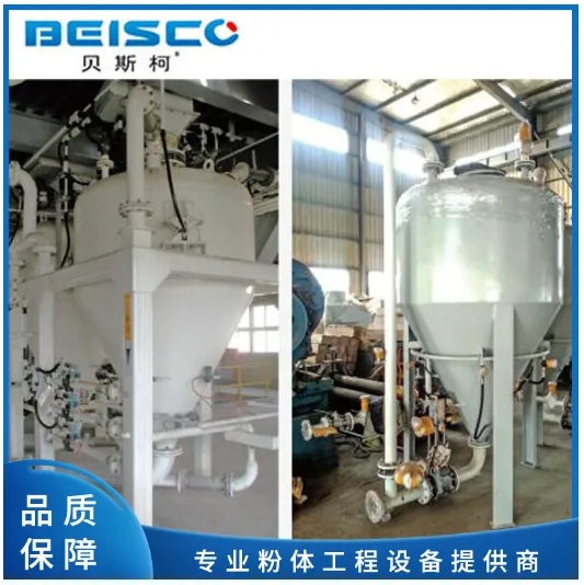 物料加入槽內(nèi),其加料量由入料時間及粉位計控制,當粉位計達滿料位時,加壓閥開啟,壓縮空氣進入槽內(nèi),此時槽內(nèi)充壓并攪動粉粒體,當槽內(nèi)部壓力達到設定壓力時,出料閥開啟原料由輸送槽流入管線至目的地,通過脈沖閥空氣交替加壓至壓力槽和空氣斷料器使管線內(nèi)呈間斷柱流輸送,實現(xiàn)高壓低速輸送;當物料輸送完成后,出料閥及加壓閥關閉,輸送結束。
