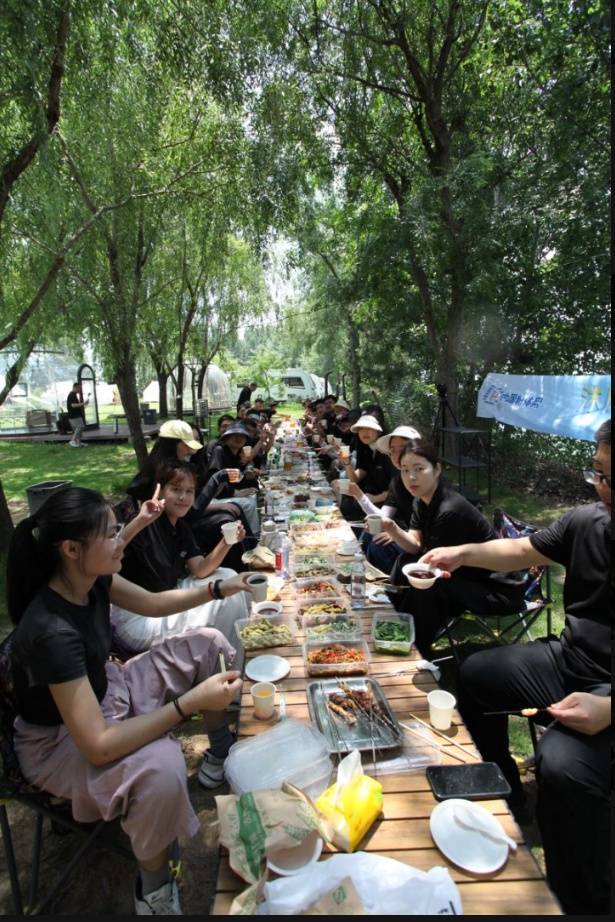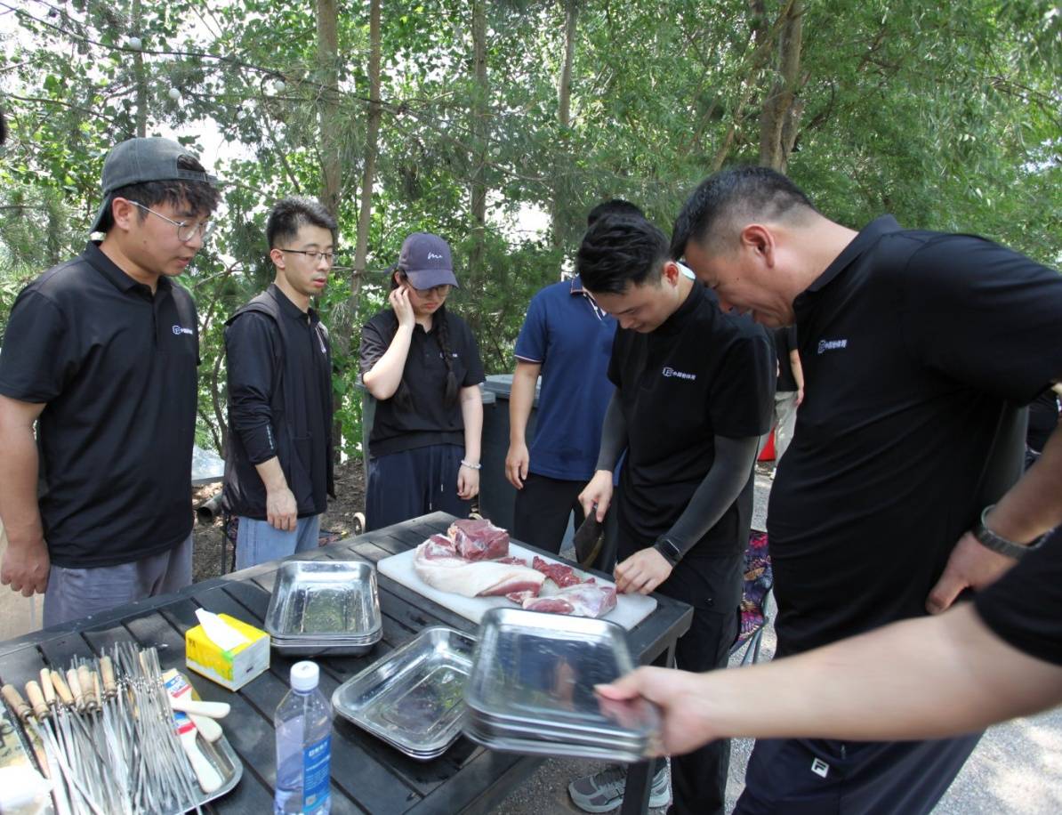 游戲的歡呼余韻未散,眾人便迅速投入燒烤“美食戰(zhàn)場”。大家密切配合,有的熟練地將鮮嫩肉塊切成小塊;有的則化身“串串大師”將肉塊錯落有致地串在竹簽上;經(jīng)驗(yàn)豐富的“燒烤達(dá)人”則守在烤爐旁,精準(zhǔn)把控火候,適時翻面。炭火噼啪作響,肉串滋滋冒油,歡聲笑語中,陣陣香氣彌漫開來,將團(tuán)建的歡樂氛圍推向新的高潮。