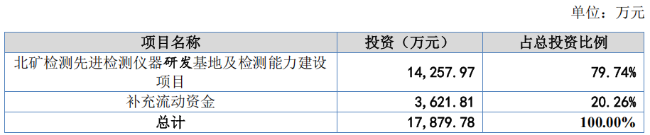 據(jù)悉,北礦檢測(cè)本次公開發(fā)行的實(shí)際募集資金扣除發(fā)行費(fèi)用后,全部用于公司主營(yíng)業(yè)務(wù)相關(guān)項(xiàng)目、主營(yíng)業(yè)務(wù)發(fā)展所需的流動(dòng)資金。北礦檢測(cè)本次發(fā)行擬募集資金 1.79 億元,擬用于以下用途: