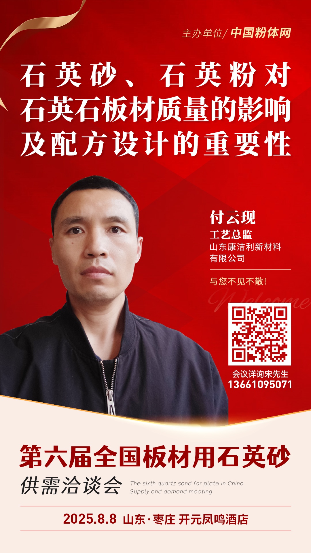 2025年8月8日,由中國粉體網(wǎng)主辦的第六屆全國板材用石英砂供需洽談會即將在山東棗莊召開,山東康潔利新材料有限公司工藝總監(jiān)付云現(xiàn)將做《石英砂、石英粉對石英石板材質(zhì)量的影響及配方設(shè)計(jì)的重要性》的報(bào)告,屆時(shí),他將對石英砂、石英粉對石英石板材質(zhì)量的影響及配方設(shè)計(jì)的重要性等問題進(jìn)行詳細(xì)解讀。