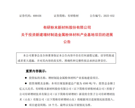 中國粉體網訊 7月9日,有研粉末新材料股份有限公司(以下簡稱“有研粉材”)發布公告,宣布通過控股子公司有研增材技術有限公司(以下簡稱“有研增材”)投資2億元,在山東濱州新建年產能4580噸的增材制造金屬粉體材料產業基地。該項目計劃18個月內建成投產,將顯著提升我國高端金屬3D打印材料的自主供應能力。