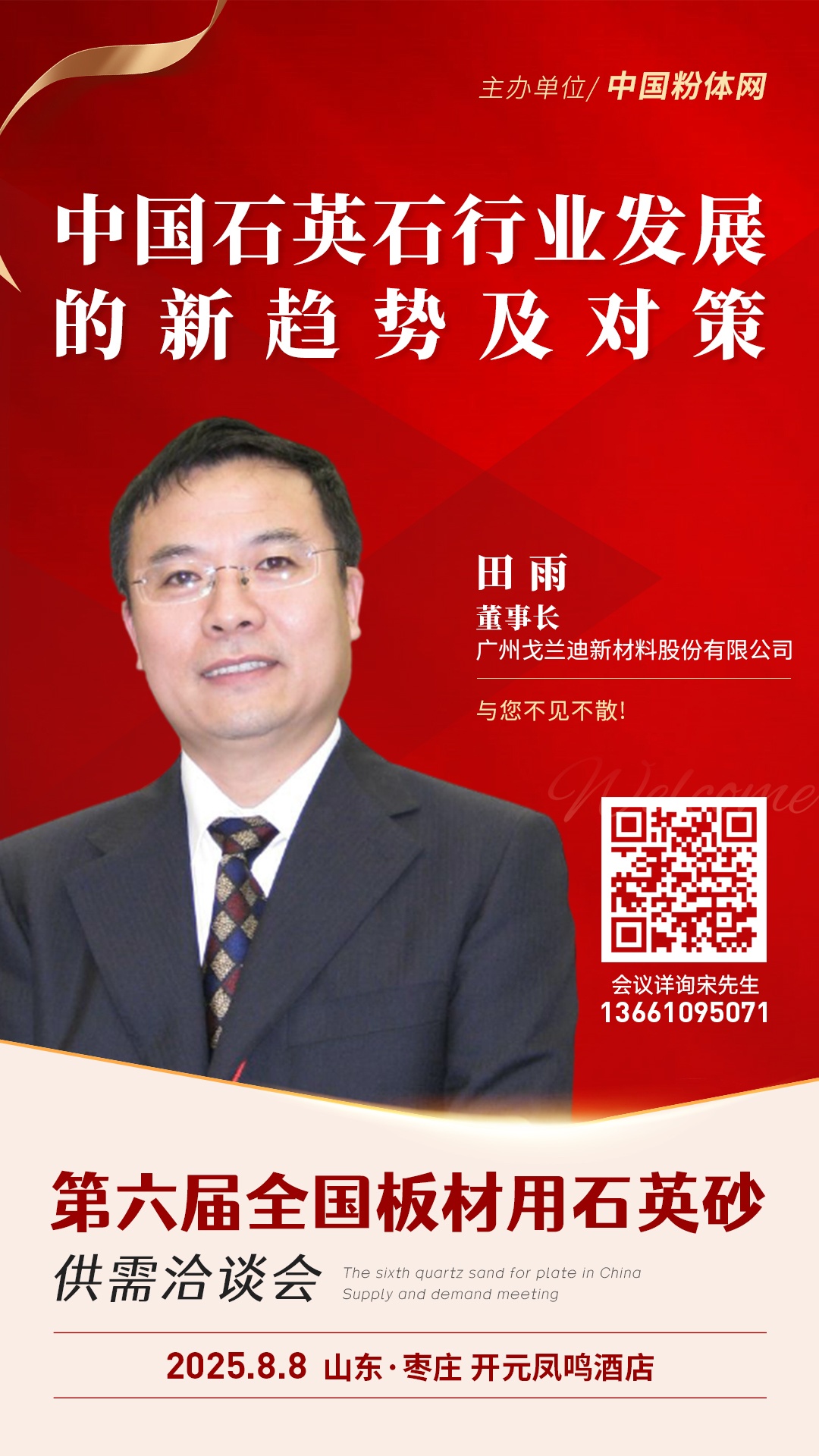 2025年8月8日,由中國粉體網(wǎng)主辦的第六屆全國板材用石英砂供需洽談會(huì)將在山東棗莊召開,廣州戈蘭迪新材料股份有限公司董事長田雨將作《中國石英石行業(yè)發(fā)展的新趨勢及對(duì)策》的報(bào)告,深度剖析行業(yè)當(dāng)前面臨的痛點(diǎn)難點(diǎn),精準(zhǔn)研判未來技術(shù)突破的核心方向,為行業(yè)發(fā)展撥開迷霧。