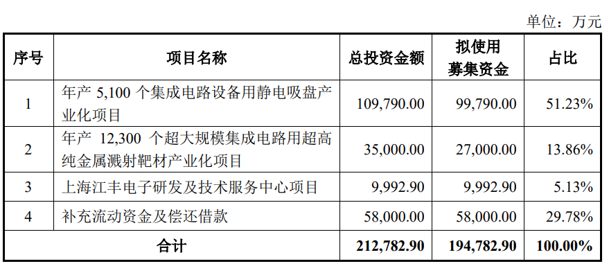 近日,江豐電子發布公告稱,公司擬通過定向增發募集資金不超過19.48億元,用于年產5,100個集成電路設備用靜電吸盤產業化項目、年產12,300個超大規模集成電路用超高純金屬濺射靶材產業化項目等項目。