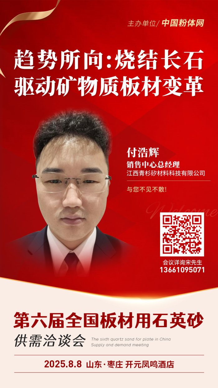 2025年8月8日,由中國粉體網主辦的第六屆全國板材用石英砂供需洽談會即將在山東棗莊召開,江西青杉矽材料科技有限公司銷售中心總經理付浩輝將做《趨勢所向:燒結長石驅動礦物質板材變革》的報告,屆時,他將圍繞“燒結長石驅動礦物板材變革”等核心議題展開詳細解讀。
