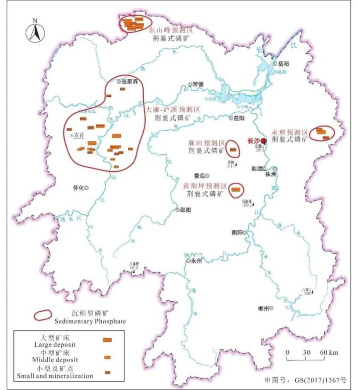 湖南省是一個磷礦資源豐富的地區,磷礦類型以海相沉積磷塊巖礦床為主,總共有76處礦產地被發現,其中38個探明了小型規模以上的儲量。這些磷礦主要分布在湘西北和湘東北地區,約90%以上的磷礦資源集中在常德、懷化、湘西、長沙等市州。根據全省磷礦床的分布情況以及成礦地質條件的結果分析,重要遠景區分別分布在東山峰、大庸—瀘溪和永和地區。