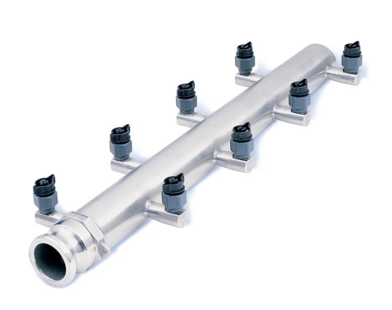 窄角噴嘴的噴嘴間距使噴霧能有效地穿透輸送墊而不會打翻罐頭。這種風格的立管也可以設計成在巴氏殺菌過程中使用空心錐形噴嘴,以確保液體在整個輸送機寬度上均勻分布。