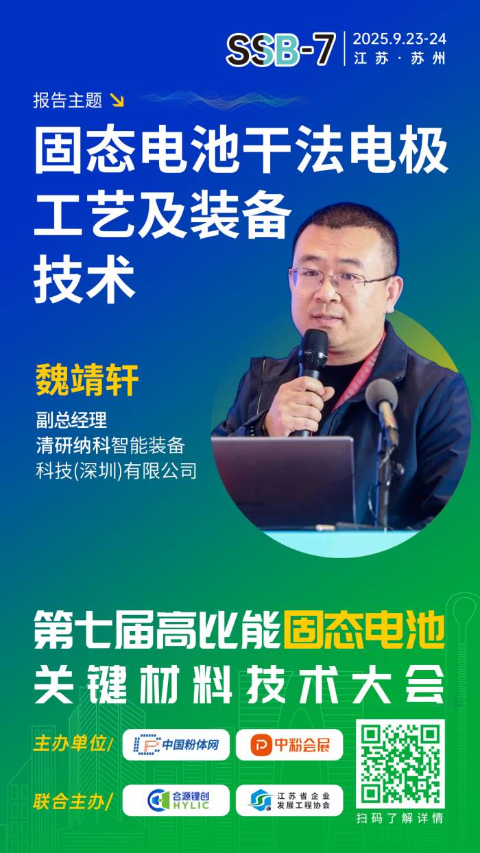 中國粉體網聯合合源鋰創、江蘇省企業發展工程協會,將于2025年9月23-24日在蘇州舉辦第七屆高比能固態電池關鍵材料技術大會。本次大會將聚焦固態電解質、正負極材料、界面工程、智能制造及產業化進展等熱點議題,深入探討固態電池的未來發展趨勢及挑戰。為致力于固態電池技術開發的企業,科研院校,以及新能源汽車、儲能、消費電子等終端企業提供信息交流的平臺,開展產、學、研合作,助推固態電池產業化。屆時,清研納科智能裝備科技(深圳)有限公司副總經理魏靖軒將作題為《固態電池干法電極工藝及裝備技術》的報告。