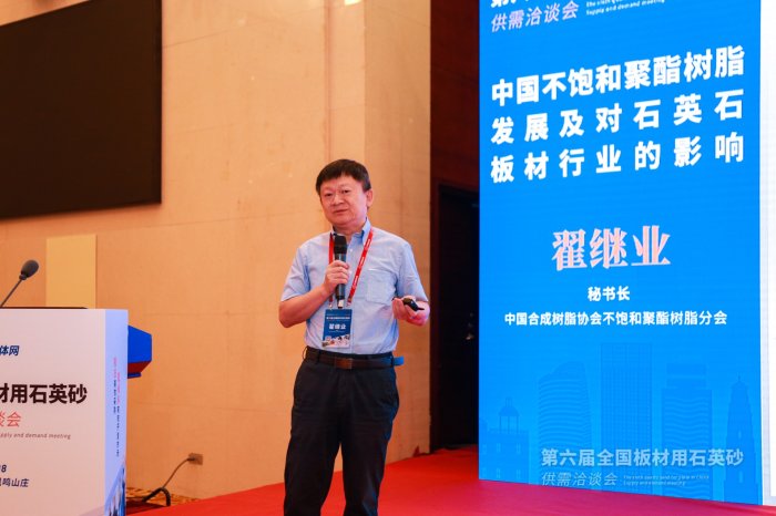 翟繼業秘書長圍繞中國不飽和聚酯樹脂行業發展展開了深度剖析:首先從核心數據維度切入,詳細介紹了該行業在產能產量、出口規模、產銷量等關鍵指標上的基本發展情況;接著聚焦領域痛點,深入分析了中國石英石樹脂在應用與發展中主要存在的問題;最后立足技術革新視角,明確指明了石英石用不飽和聚酯樹脂未來的技術發展方向。