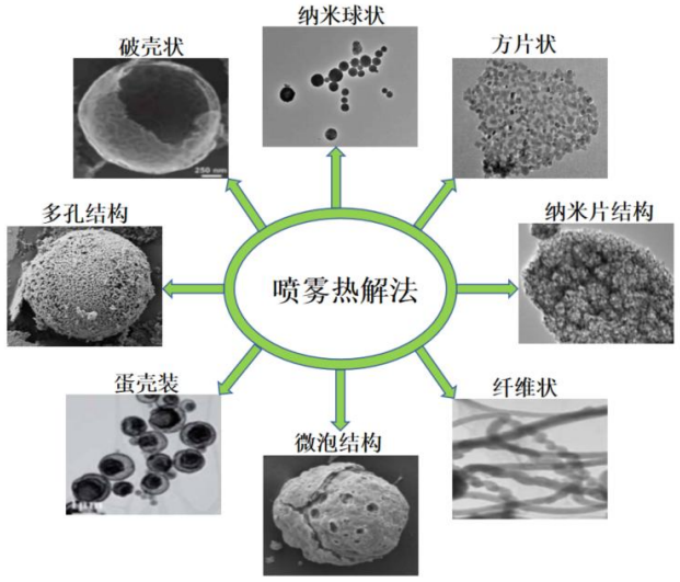 噴霧熱解已被證明是一種簡便的制備復合材料和各種納米粉體材料的有效方法,通過設計前驅溶液組成,調控工藝參數,可以制備出中空結構、致密球體、蛋黃殼結構、核殼結構、納米板、納米棒、納米薄膜等各種納米材料。