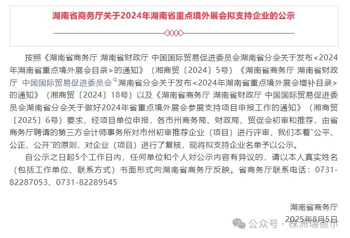 近日,湖南省商務(wù)廳公示 2024 年湖南省重點境外展會擬支持企業(yè)名單,株洲瑞德爾智能熱工裝備股份有限公司成功入選!