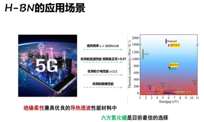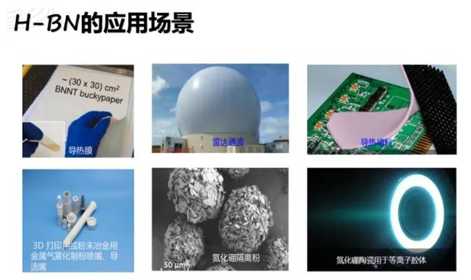 六方氮化硼(h-BN)是一種由硼原子和氮原子交替排列形成的層狀六方晶體結構共價化合物。其外觀通常呈現為白色、松散且具有光滑感的粉末。與石墨不同,六方氮化硼是一種寬禁帶半導體材料,它的電絕緣性能、透電磁波性能、中子吸收性能、介電性能、空氣中的熱穩定性能比石墨更為突出,六方氮化硼是目前較為優良的絕緣、導熱、透波材料。這些特性使得六方氮化硼在電子、核能、航空航天等領域具有廣泛的應用前景。