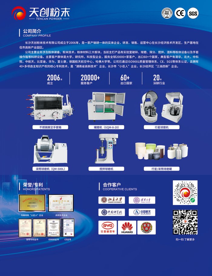 公司主要業務涉及粉體裝備,粉末技術,粉體材料三大板塊,當前主打產品有實驗室破碎、球磨、篩分、攪拌、混料等粉體設備以及手套操作箱等科研設備。主要客戶群體是大學,研究所,科技型企業,服務全球20000+家客戶,出口60+個國家,典型客戶有清華,北大,中科院,中航天,比亞迪,華為,富士康,徳國航天航空中心,哈佛大學等。公司已通過ISO9001質量管理體系、CE、SGS等體系認證,且擁有40+多項自主知識產權的核心專利技術,是“湖南省高新技術”企業,長沙市“小巨人”企業,長沙經開區“三高四新”企業。