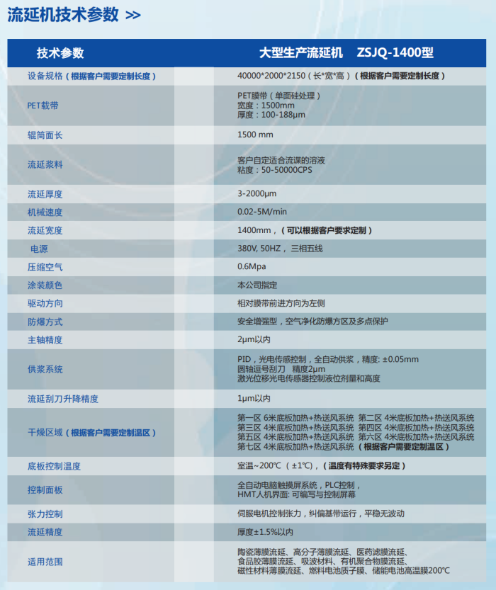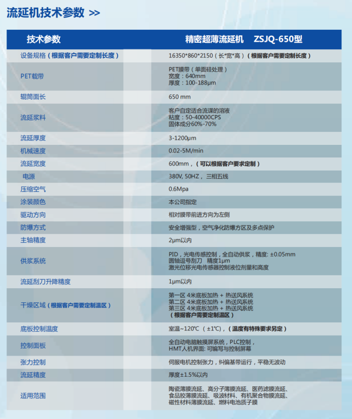 公司主要產品有流延機(涂布機),49/S電子晶體外殼,石油抽油泵柱塞及金屬表面處理。公司研發設計的流延機引進國外先進技術,其性能、要求、技術,外觀、環保、節能在國內屬領先水平,質量好,性價比高。對于流延機的研發制造始終以高標準、高技術、高門檻的研究創新精神去突破。嚴謹專注的態度去優化性能,客戶至上的態度去解決痛點,開拓創新的態度去攻克技術難關,追求卓越的態度去提升工藝精度。研發生產的流延機完全可以流延固態電池膜、液流電池膜、氫燃料電池膜、氧化鋁﹑氮化鋁﹑氧化鋯﹑鐵氧體﹑防彈衣膜、吸波波材料、橡膠薄膜、石墨烯、有機聚合物膜、金屬粉濾膜、封裝陶瓷類產品和各種過濾膜并銷往國內各企業,贏得了不錯的好評。